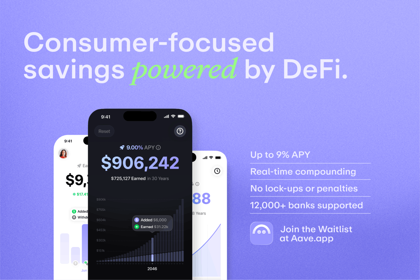 Aave App is a mobile app that offers a high-yield savings alternative with up to 9% APY. Interest compounds in real time, with withdrawals available at any time. The app supports deposits from more than 12,000 banks, debit cards, and stablecoins, and includes up to $1 million in balance protection.