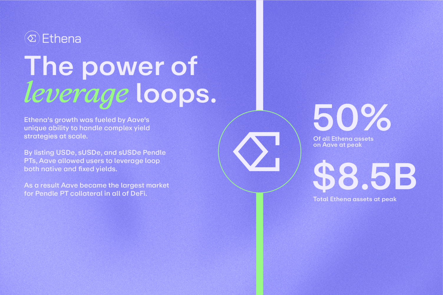 These listings allowed Ethena users to leverage loop native yield. When Aave later added sUSDe Pendle PTs, users could leverage loop fixed yield as well. Soon after, Aave became the largest market using Pendle PTs as collateral in DeFi. The partnership brought $8.5 billion in Ethena-related assets to Aave, showing that only Aave could support yield strategies at this scale.